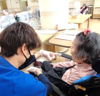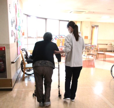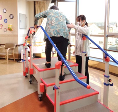 在宅復帰の実現やより良い施設生活の継続のため、日常のケアに加えて運動機能(関節の動きや筋力など)訓練・基本動作(寝返り・起き上がり・起立・歩行など)訓練・日常生活活動(食事・排泄・更衣・入浴など)訓練・環境整備など、利用者様の状態や状況に合わせて様々なリハビリを提案・実施しています。